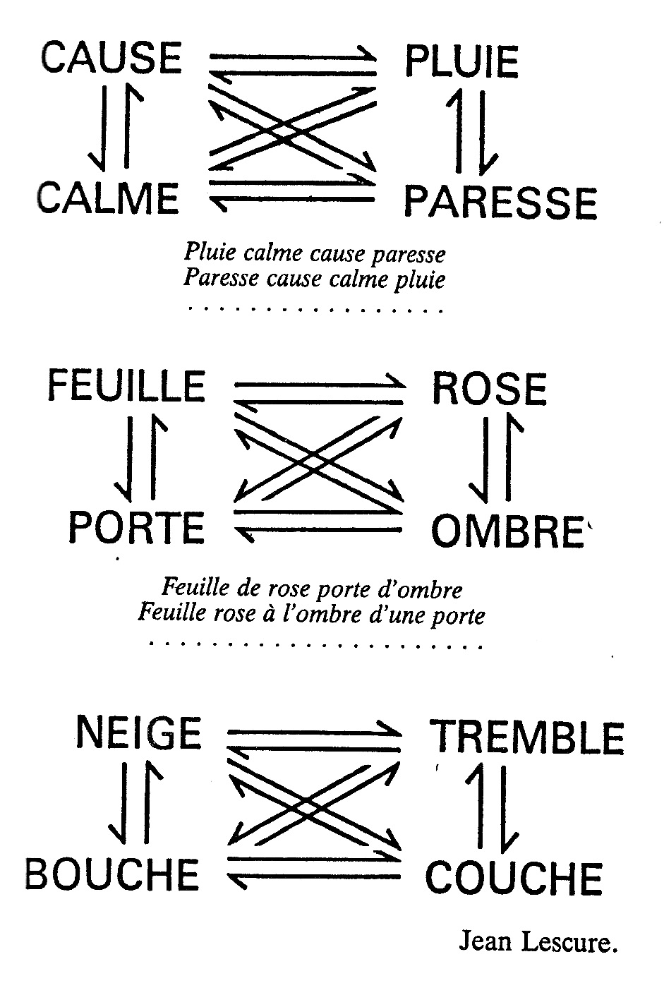 - Les diagrammes du même acabit proposés par Jean Lescure pour composer des poèmes 35.jpg. - Les schémas variés de Pierre Rosenstiehl dans «Le labyrinthe des jours ordinaires» 36.jpg.