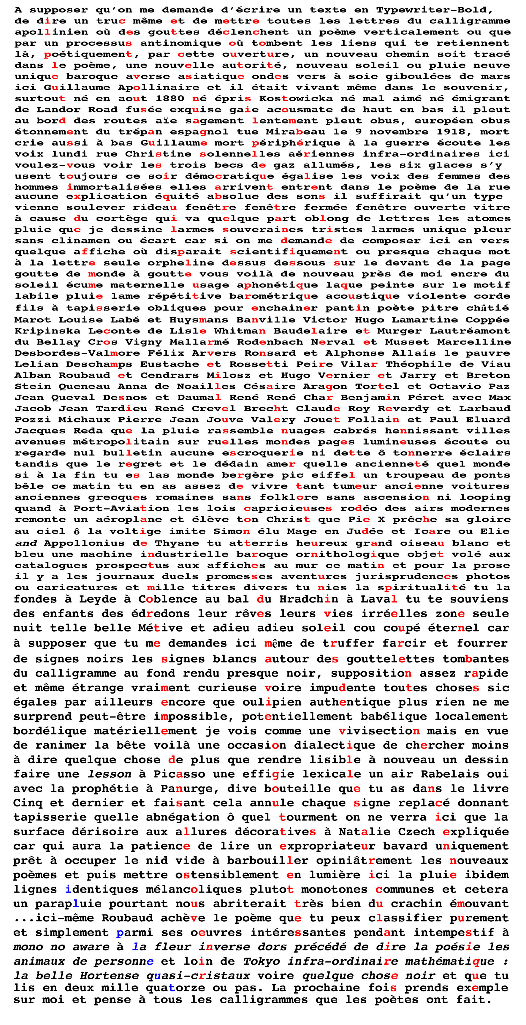 - «Il pleut», texte de Jacques Roubaud dans lequel se trouvent inscrites à leur place les lettres du calligramme éponyme d’Apollinaire 54.jpg.